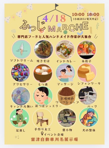 富津自動車さんで、専門店フードと人気ハンドメイド作家が大集合する「ふっじMARCHE」が開催されます。