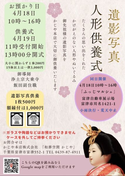また、駐車場に指定されている和葬空間かじやさんでも、「遺影写真・人形供養式」および「かじやのマルシェ」が開催されておりますので、合わせてご参加下さい。
