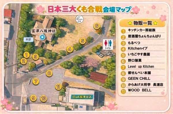 設備: 会場内にトイレ完備、指定の喫煙スペースあり(本部近く)